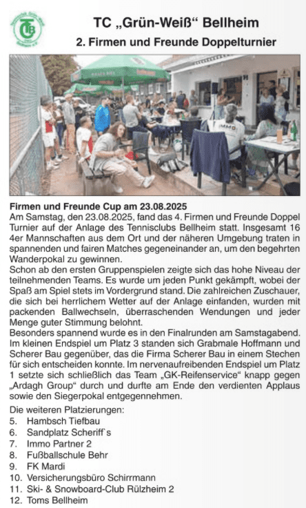 Am Samstag, 26.08.2023, fand das 2. Firmen- und Freunde-Turnier des TC GW Bellheim statt. Nach gelungenem Start im letzten Jahr fand auch das diesjährige Turnier eine super Resonanz.