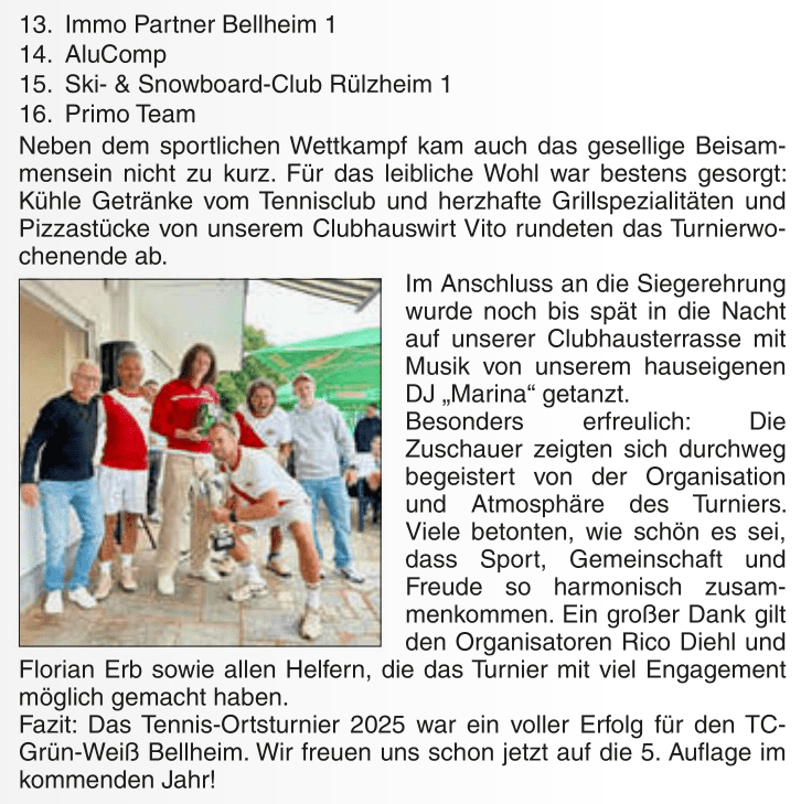 Herzlichen Dank an alle Beteiligten und ein besonderes Dankeschön an die Sponsoren, die Bellheimer Brauerei, TOM’s reale Bierbank sowie Jörg’s Tennisstube, welche die Veranstaltung mit Geld- und Sachpreisen unterstützten.
