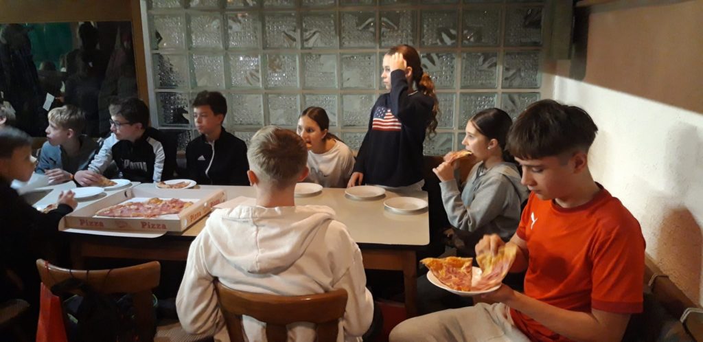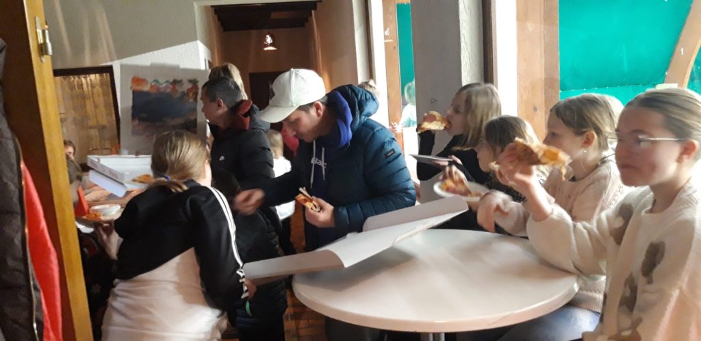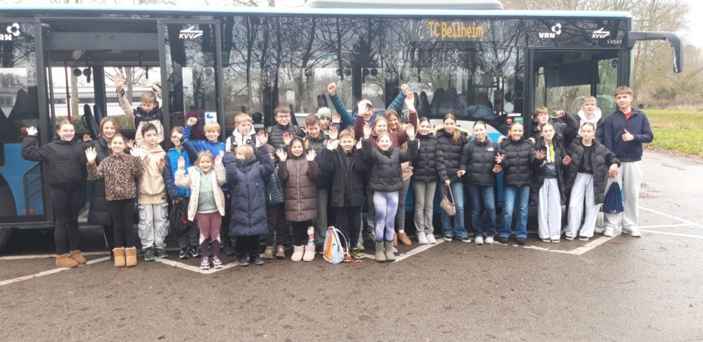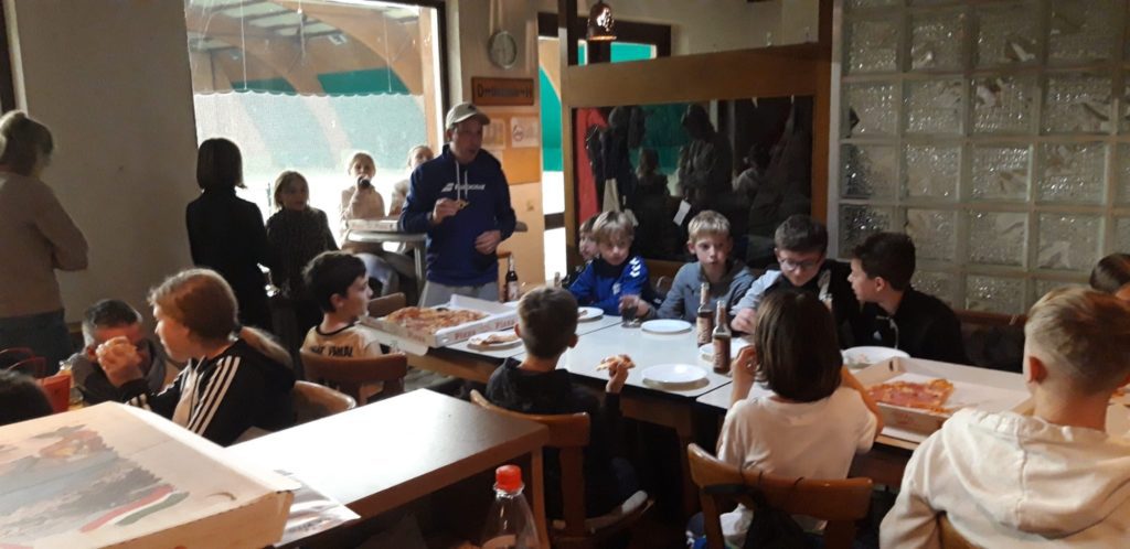 Anschließend ging es gemeinsam mit dem Bus zurück in die Tennishalle nach Bellheim. Dort warteten bereits Pizza und Getränke auf die hungrigen Sportlerinnen und Sportler, sodass der aktive Nachmittag in gemütlicher Runde ausklingen konnte. Ein besonderes Highlight zum Abschluss war das Geschenk für jedes Kind: Alle Teilnehmerinnen und Teilnehmer erhielten ein T-Shirt mit dem Vereinslogo des TC Grün-Weiß Bellheim – eine tolle Erinnerung an diesen gelungenen Tag.